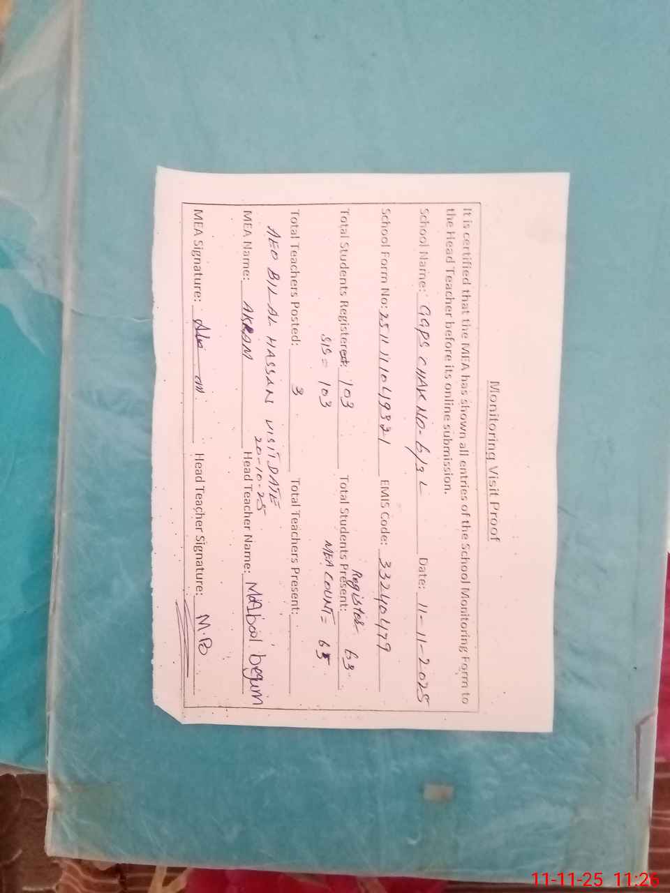 | Attendance Register | Head Teacher | MEA with School | Visit Proof |