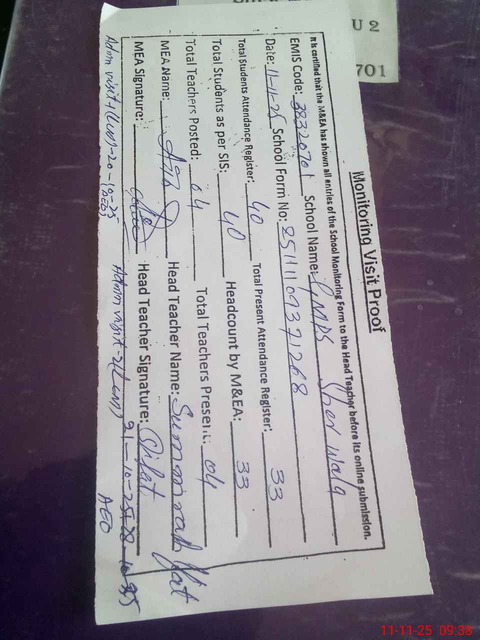 | Attendance Register | Head Teacher | MEA with School | Visit Proof |