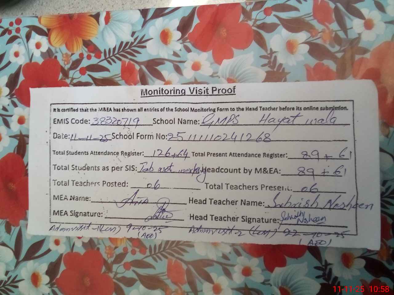| Attendance Register | Head Teacher | MEA with School | Visit Proof |