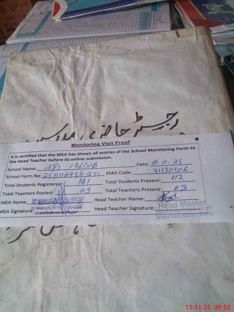 | Attendance Register | Head Teacher | MEA with School | Visit Proof |