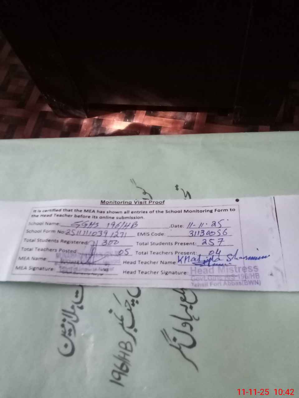 | EMIS Code: 31130056 | Name of School: GGHS CHAK NO 196 HB | |||