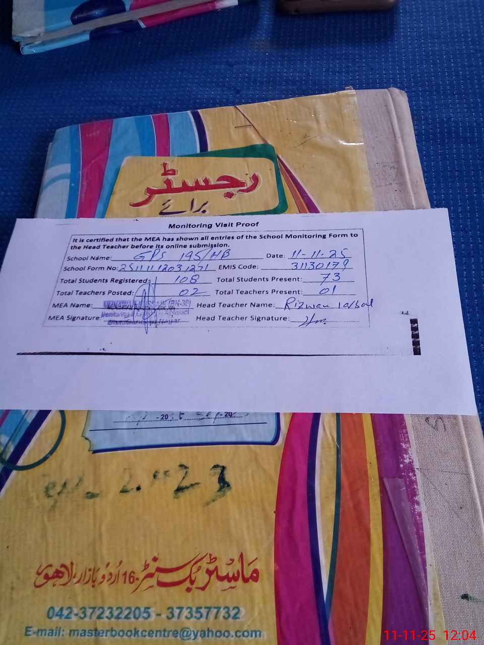 | Attendance Register | Head Teacher | MEA with School | Visit Proof |