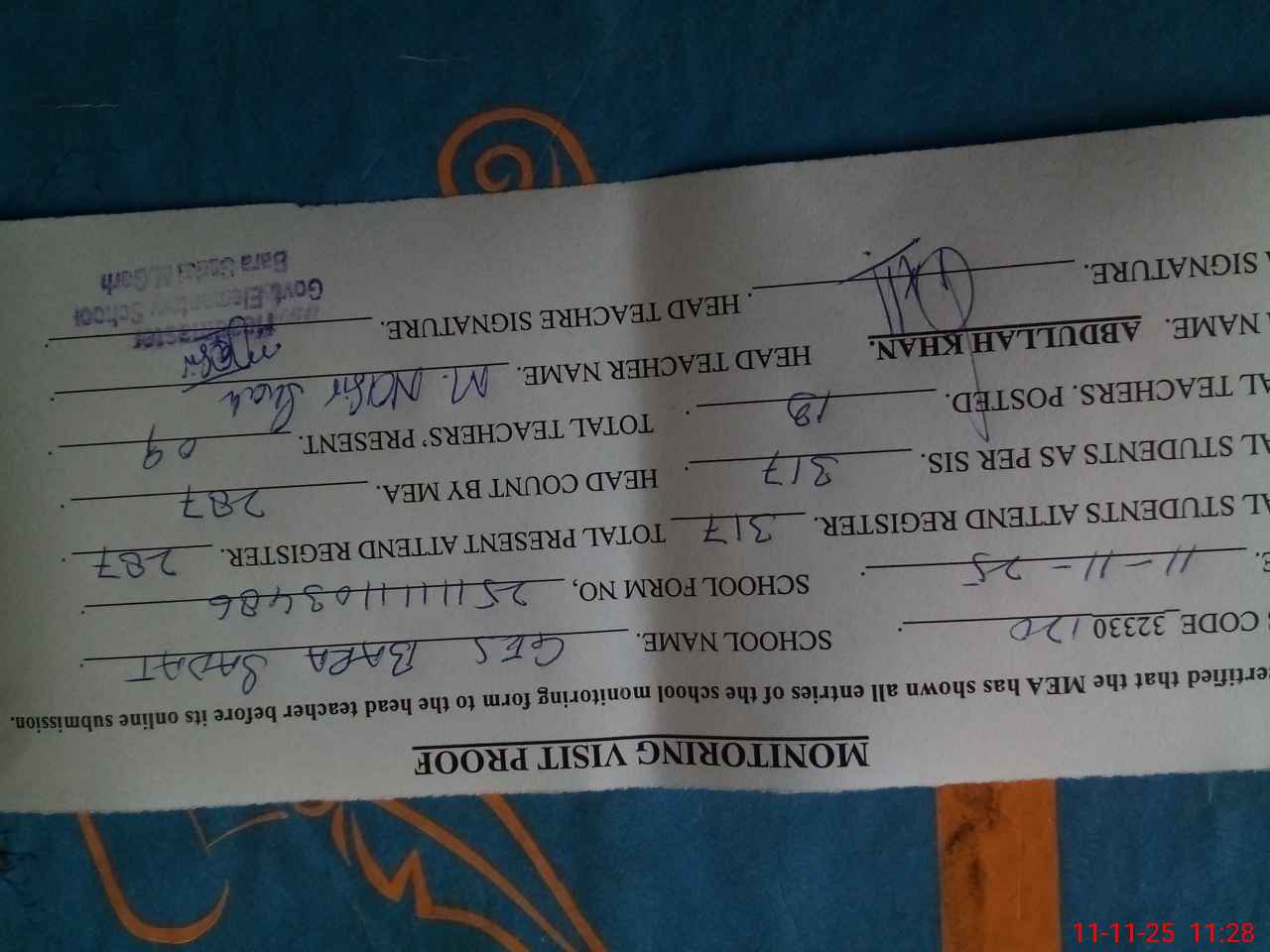 | Monitoring Date: 11-11-2025 | Start Time: 11-11-2025 11:02 AM | End Time: 11-11-2025 11:29 AM | Name of MEA: Ab**** Kh**** | |