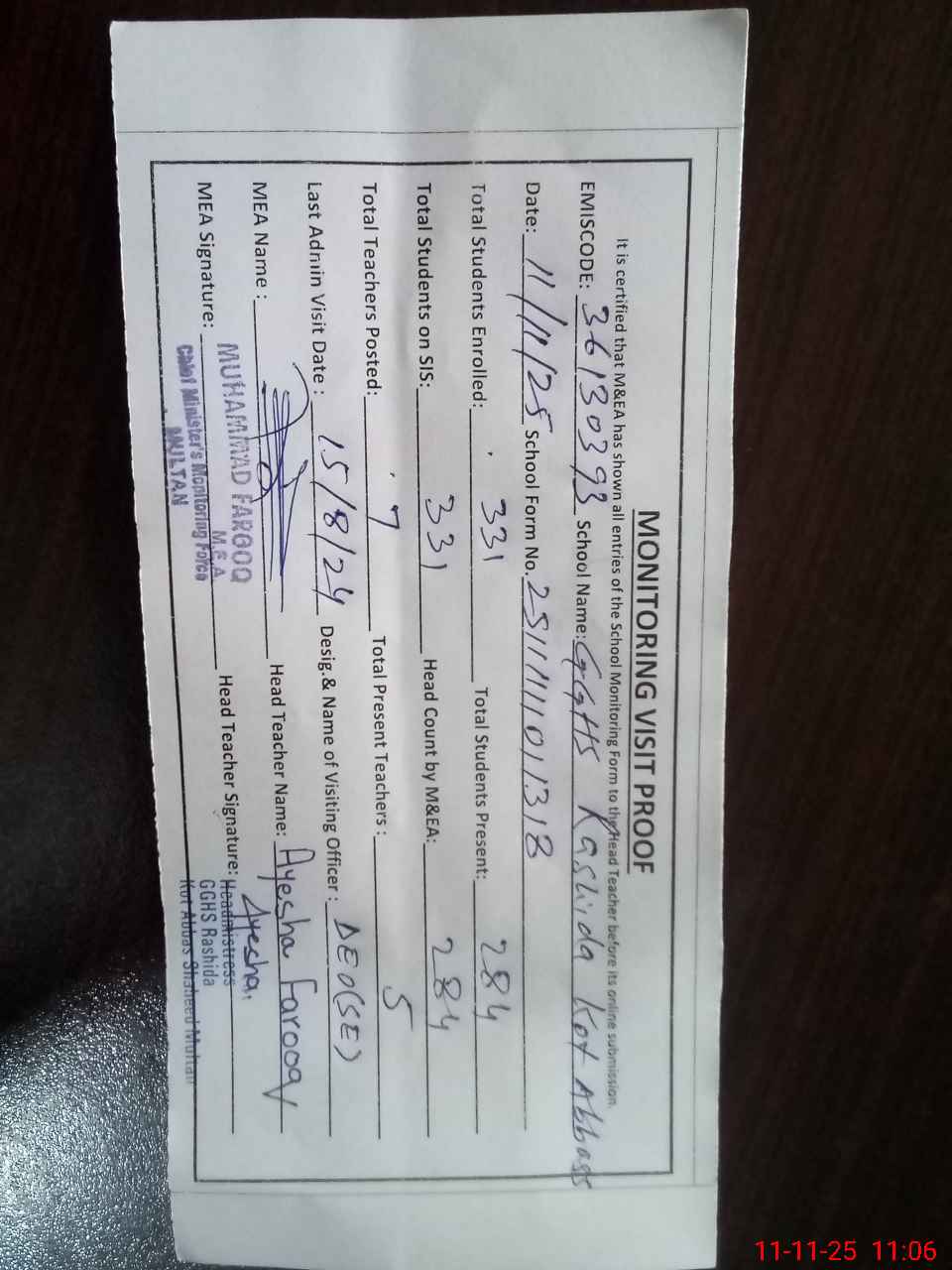 | EMIS Code: 36130393 | Name of School: GGHS RASHIDA, KOT ABBAS SHAHEED | |||