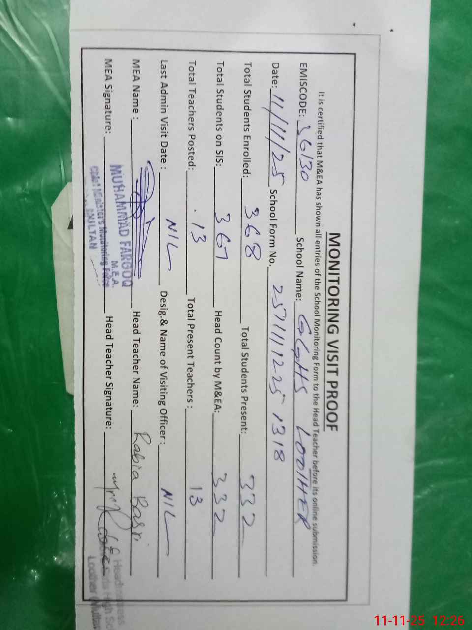| Attendance Register | Head Teacher | MEA with School | Visit Proof |
