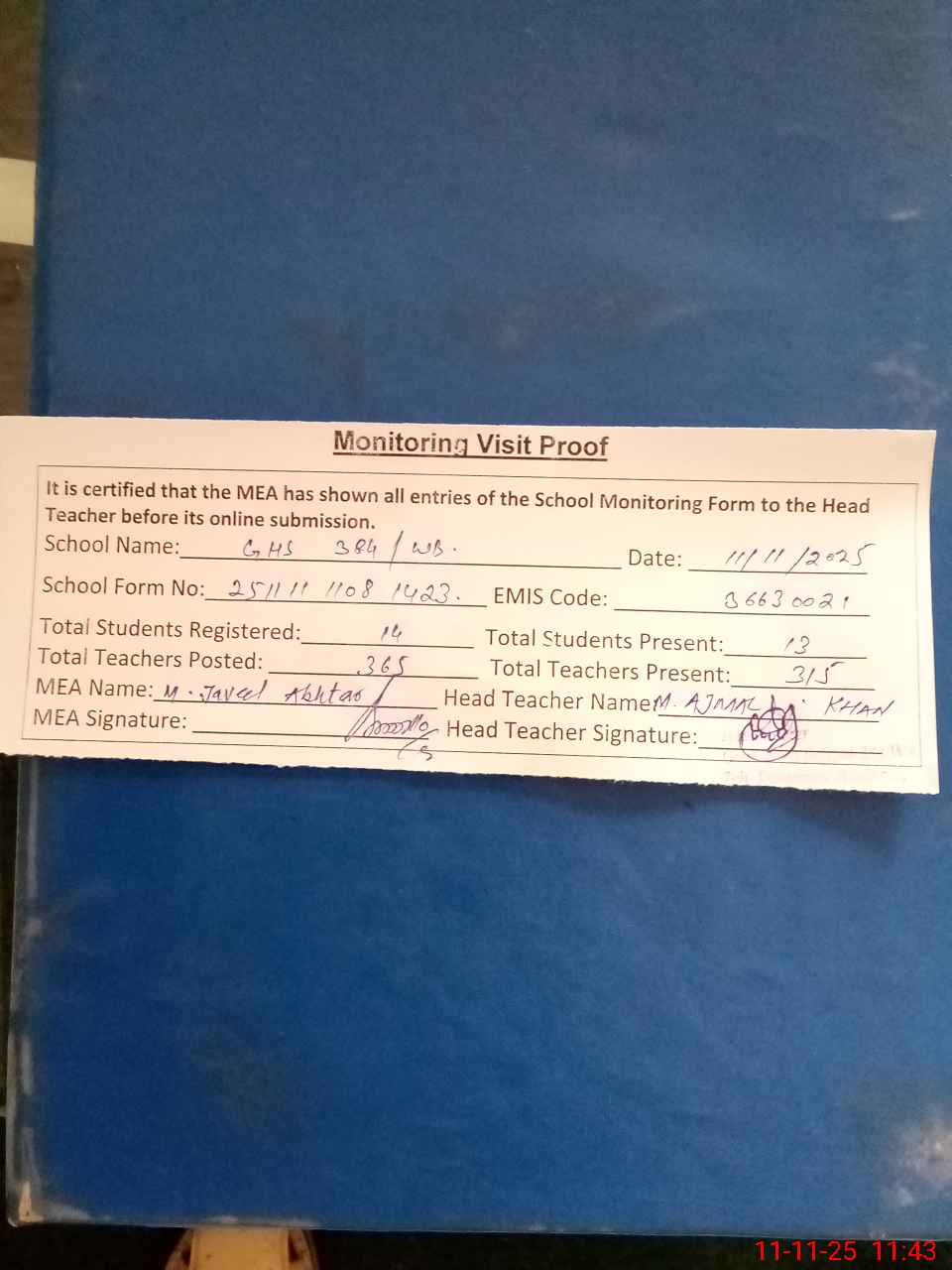 | Attendance Register | Head Teacher | MEA with School | Visit Proof |