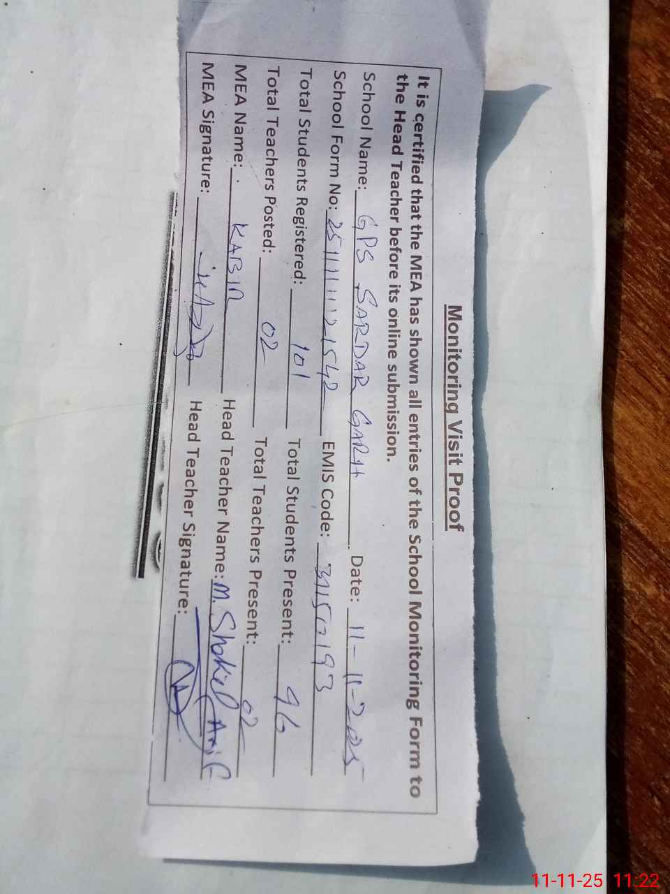 | Attendance Register | Head Teacher | MEA with School | Visit Proof |