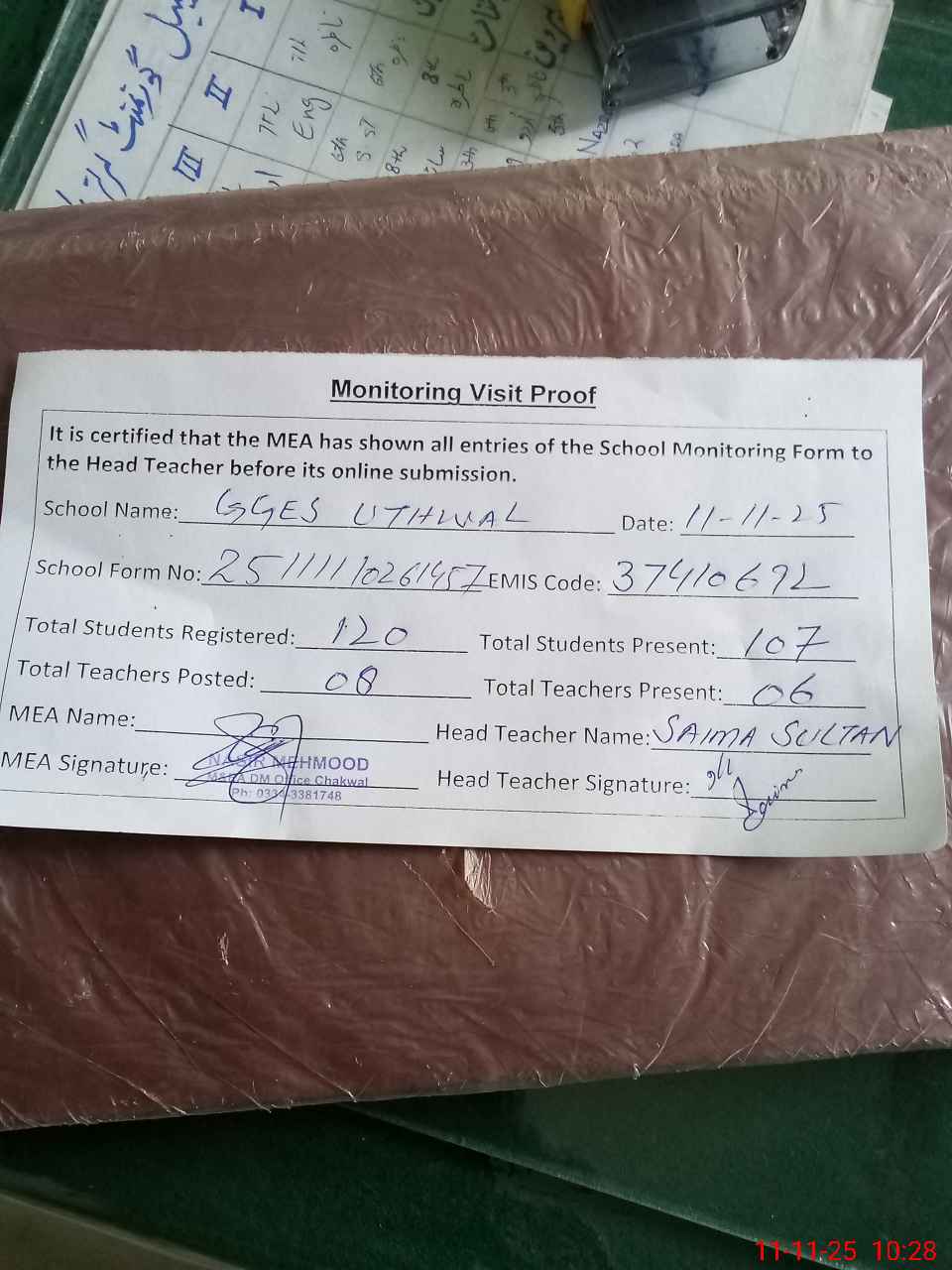 | Attendance Register | Head Teacher | MEA with School | Visit Proof |