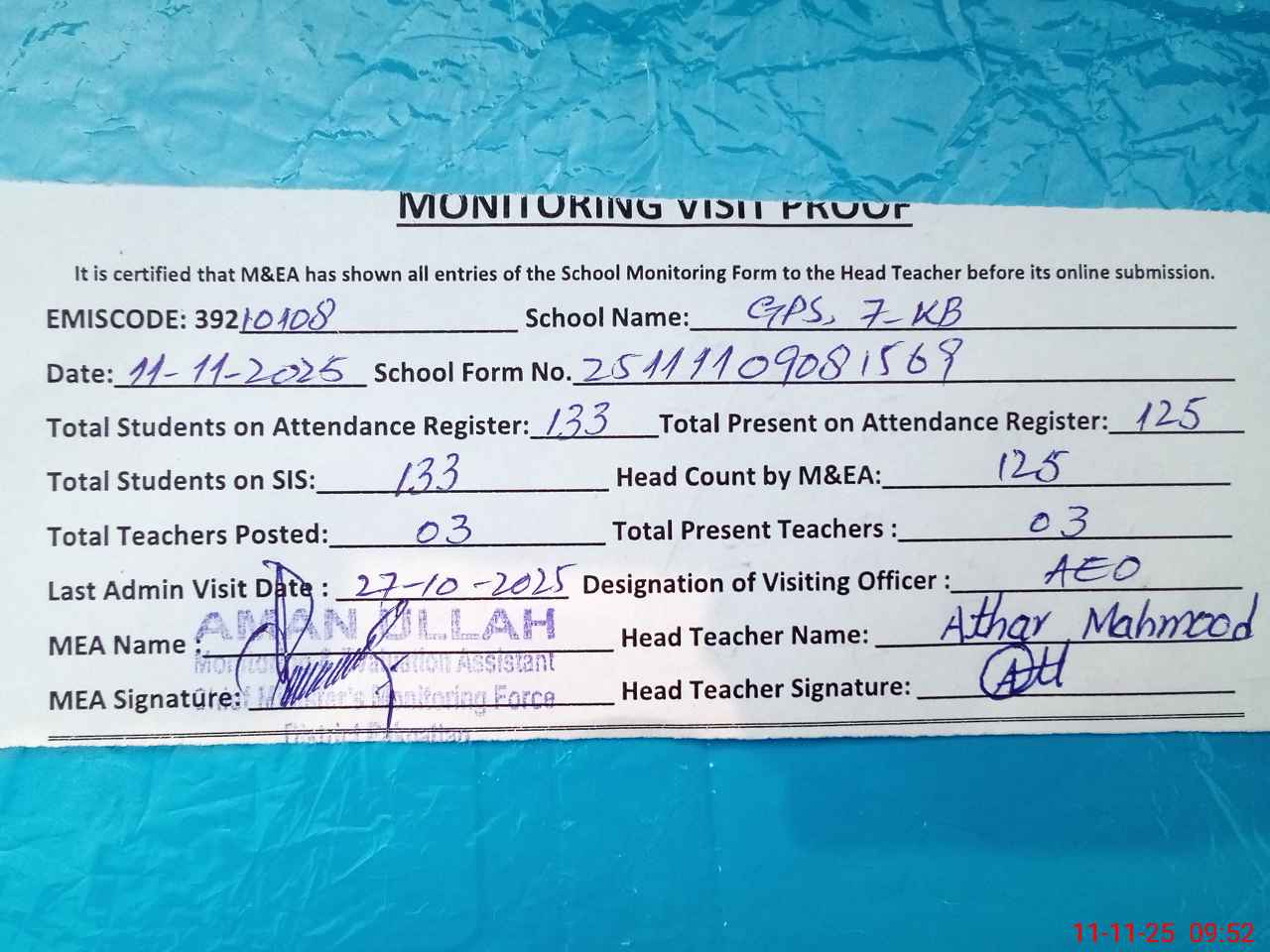| Attendance Register | Head Teacher | MEA with School | Visit Proof |
