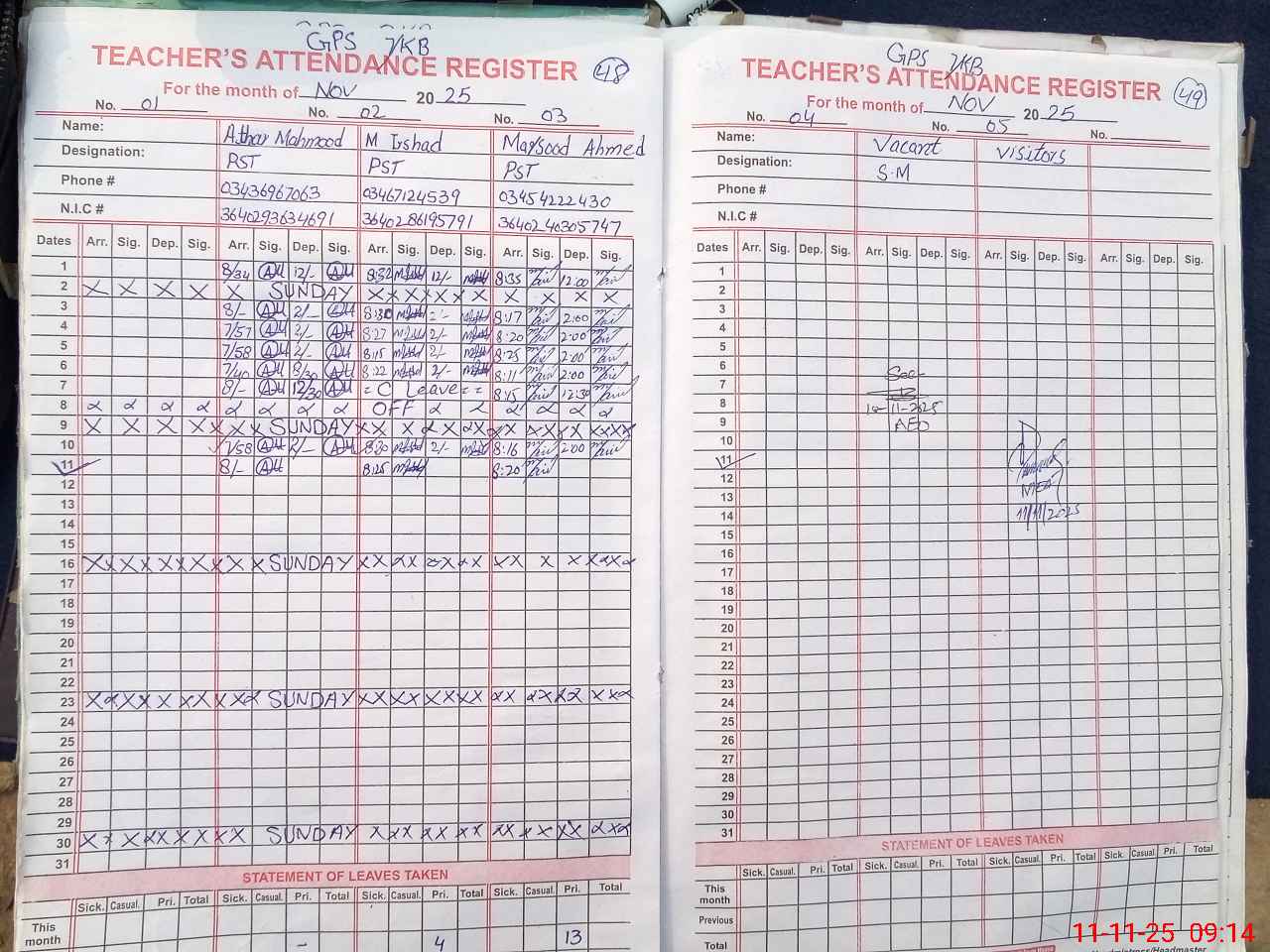 | CNIC | Full Name | Designation | R/C | Absence During Last Calender Month |