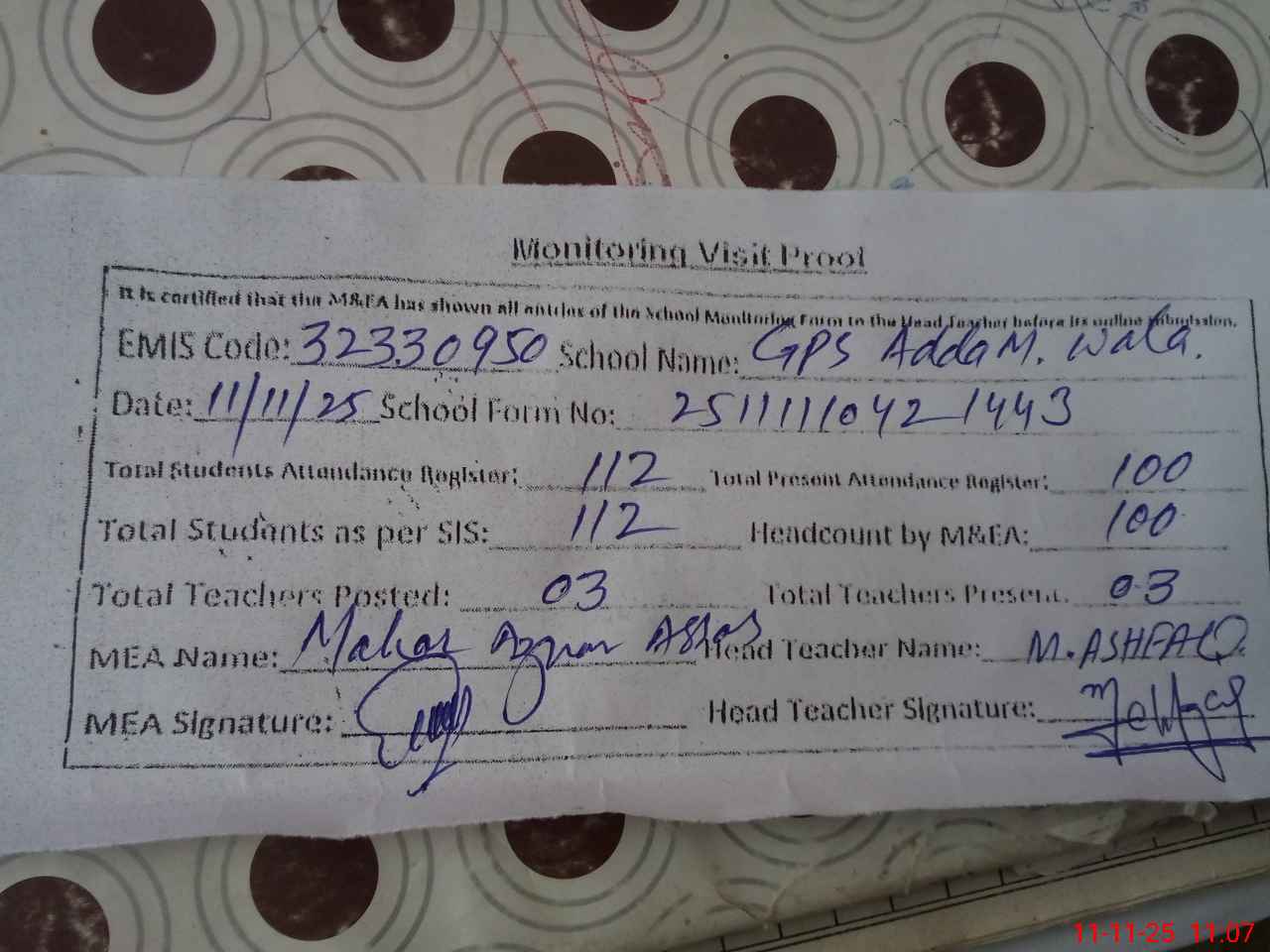 | EMIS Code: 32330950 | Name of School: GPS ADDA MUHAMMAD WALA | |||