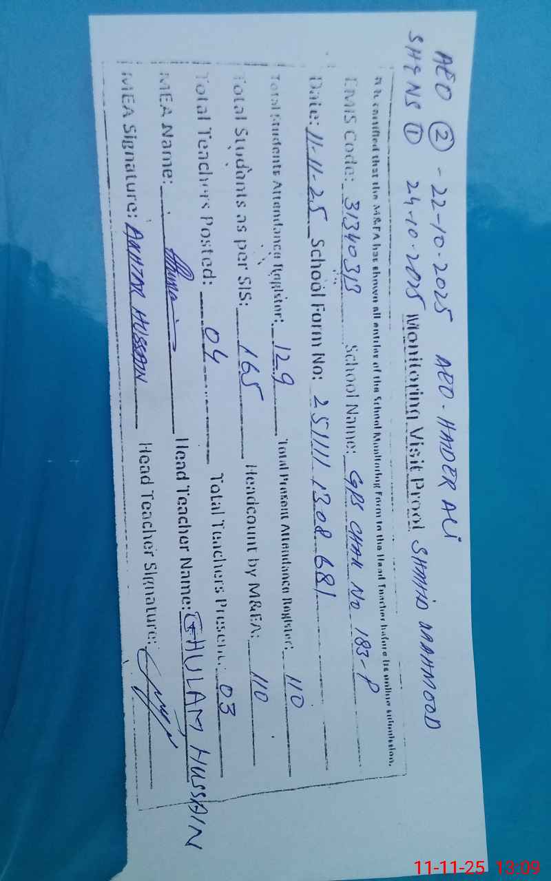 | Attendance Register | Head Teacher | MEA with School | Visit Proof |