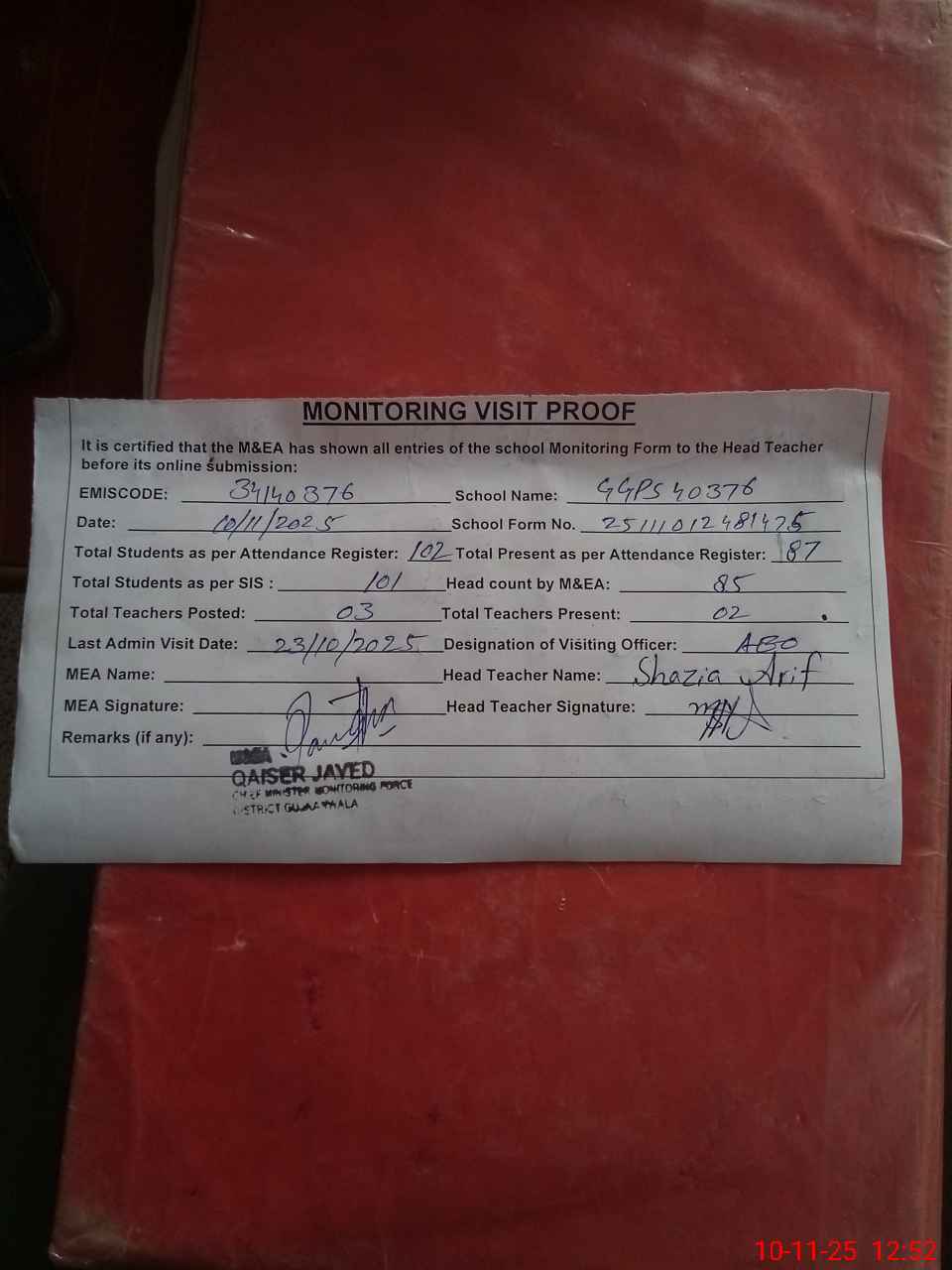 | Attendance Register | Head Teacher | MEA with School | Visit Proof |