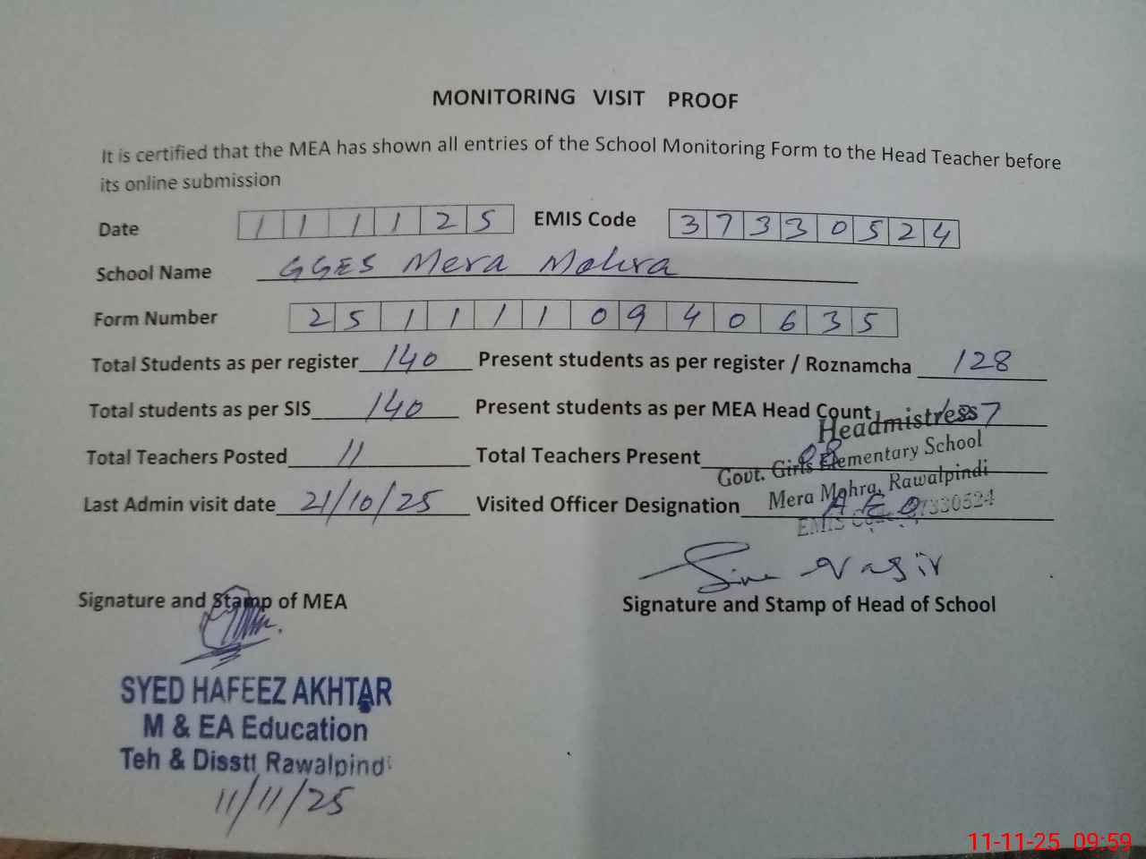| Monitoring Date: 11-11-2025 | Start Time: 11-11-2025 09:10 AM | End Time: 11-11-2025 10:07 AM | Name of MEA: Sy**** Ha**** Ak**** | |