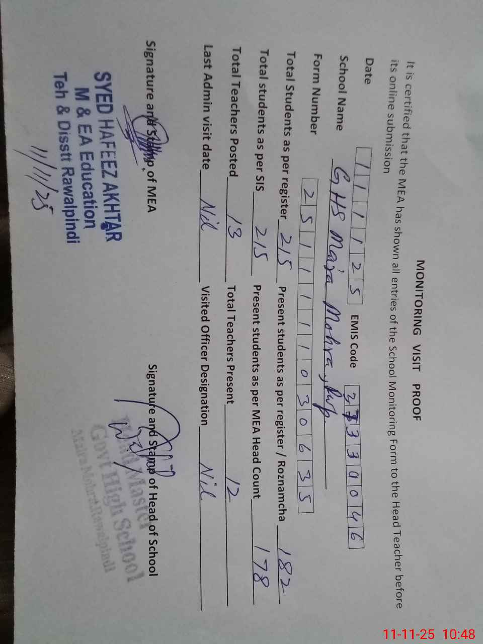 | Certified that this School was Inspected by the Undersigned MEA/DMO Today and the Information Stated Above is as Per Record. | |||||