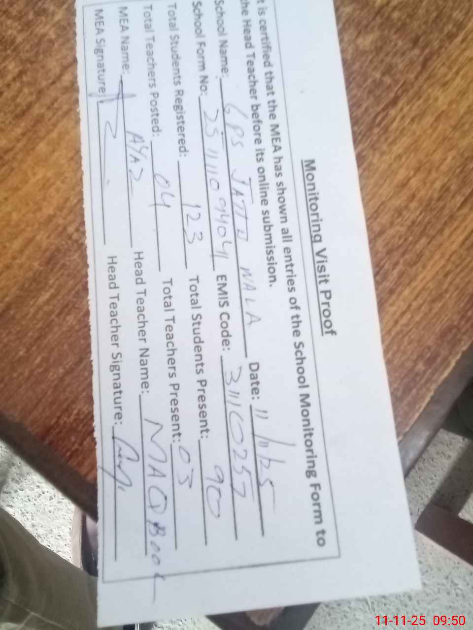 | Attendance Register | Head Teacher | MEA with School | Visit Proof |