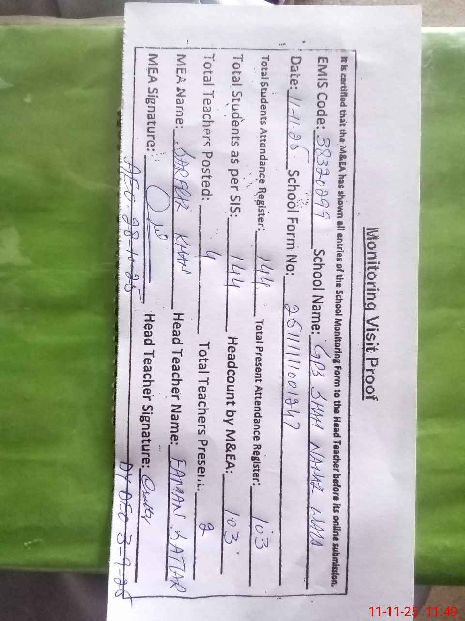 | Attendance Register | Head Teacher | MEA with School | Visit Proof |
