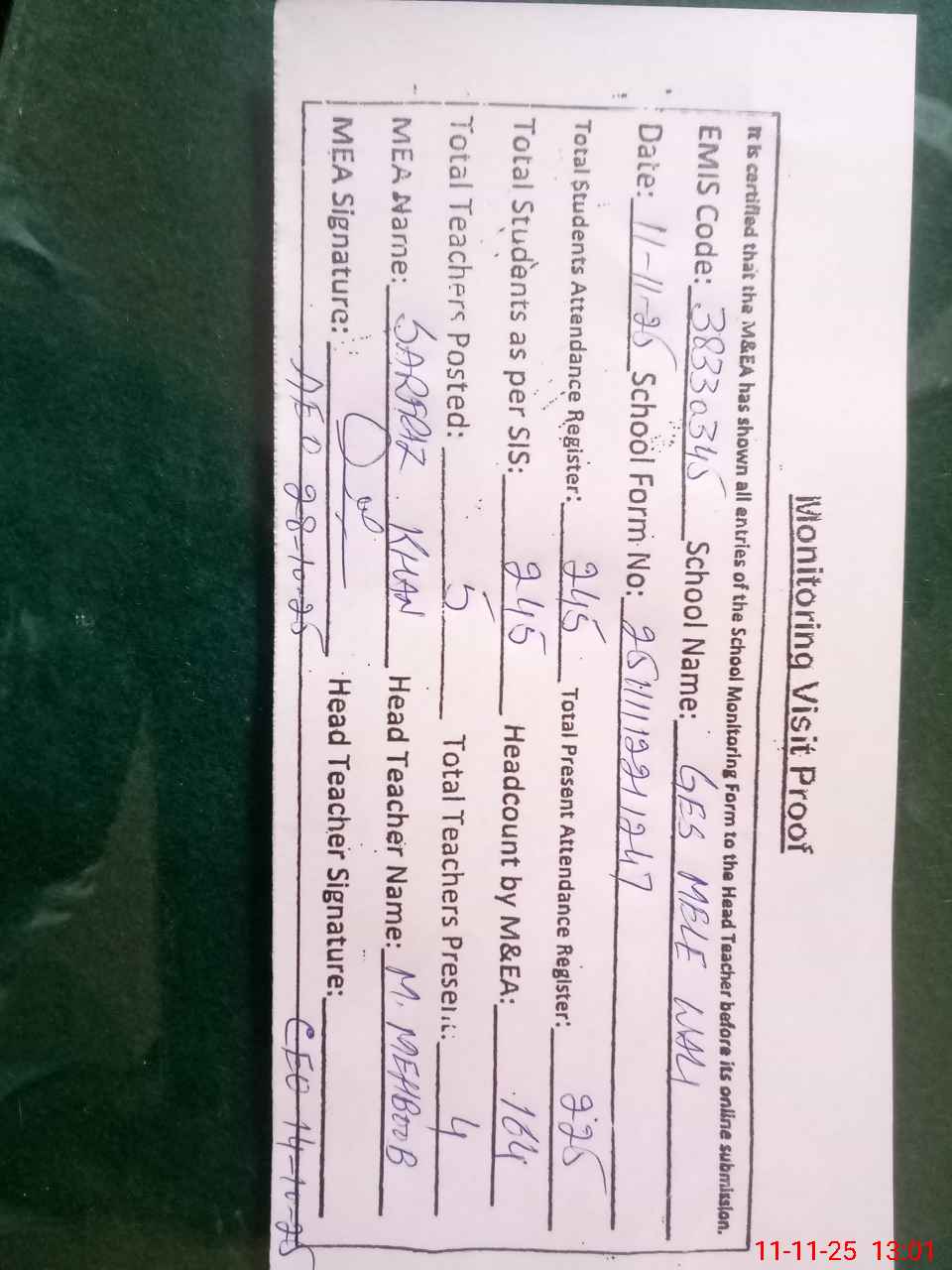 | EMIS Code: 38330345 | Name of School: GES MELE WALI KUNDIAN MIANWALI | |||