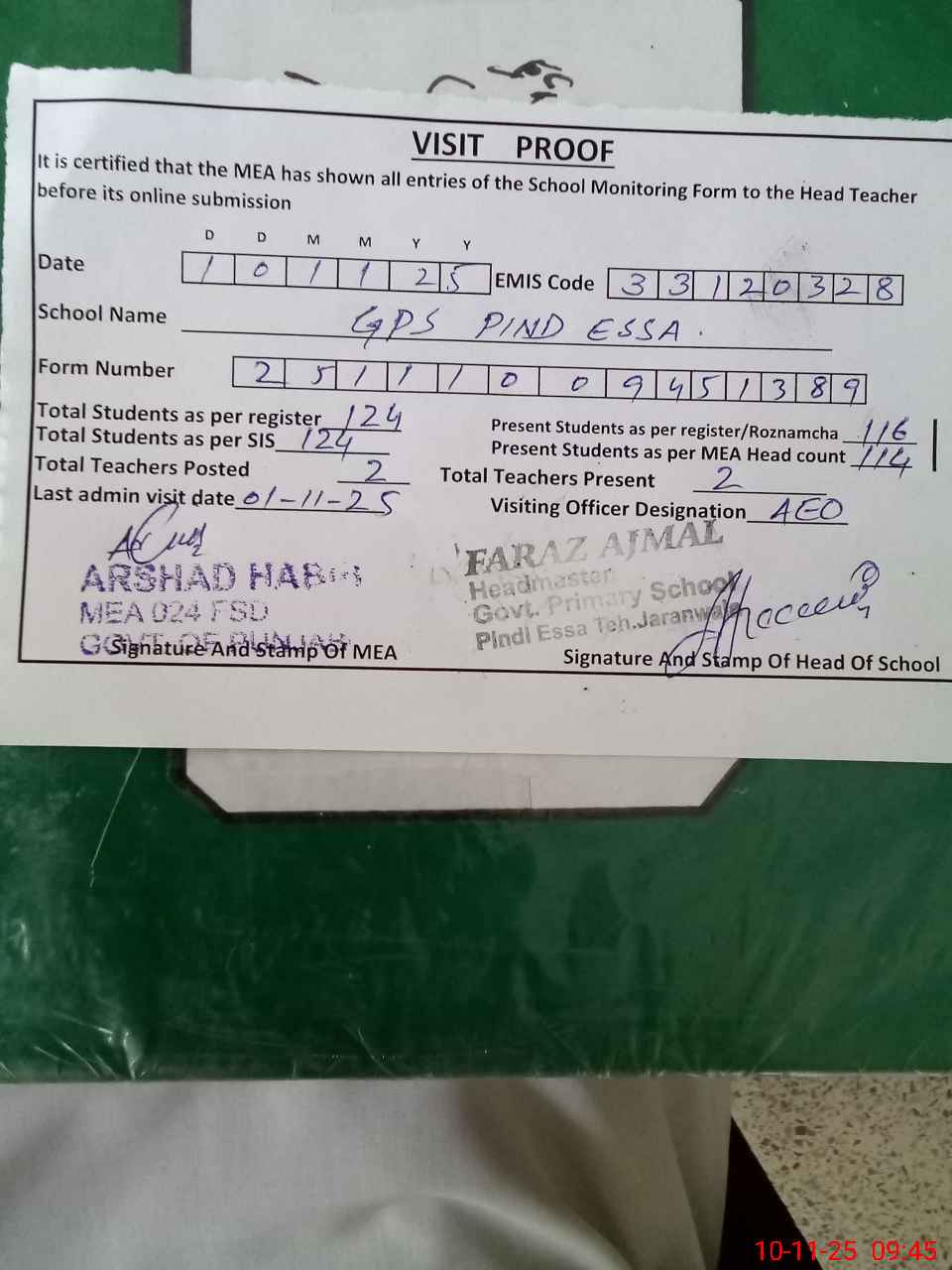 | Attendance Register | Head Teacher | MEA with School | Visit Proof |