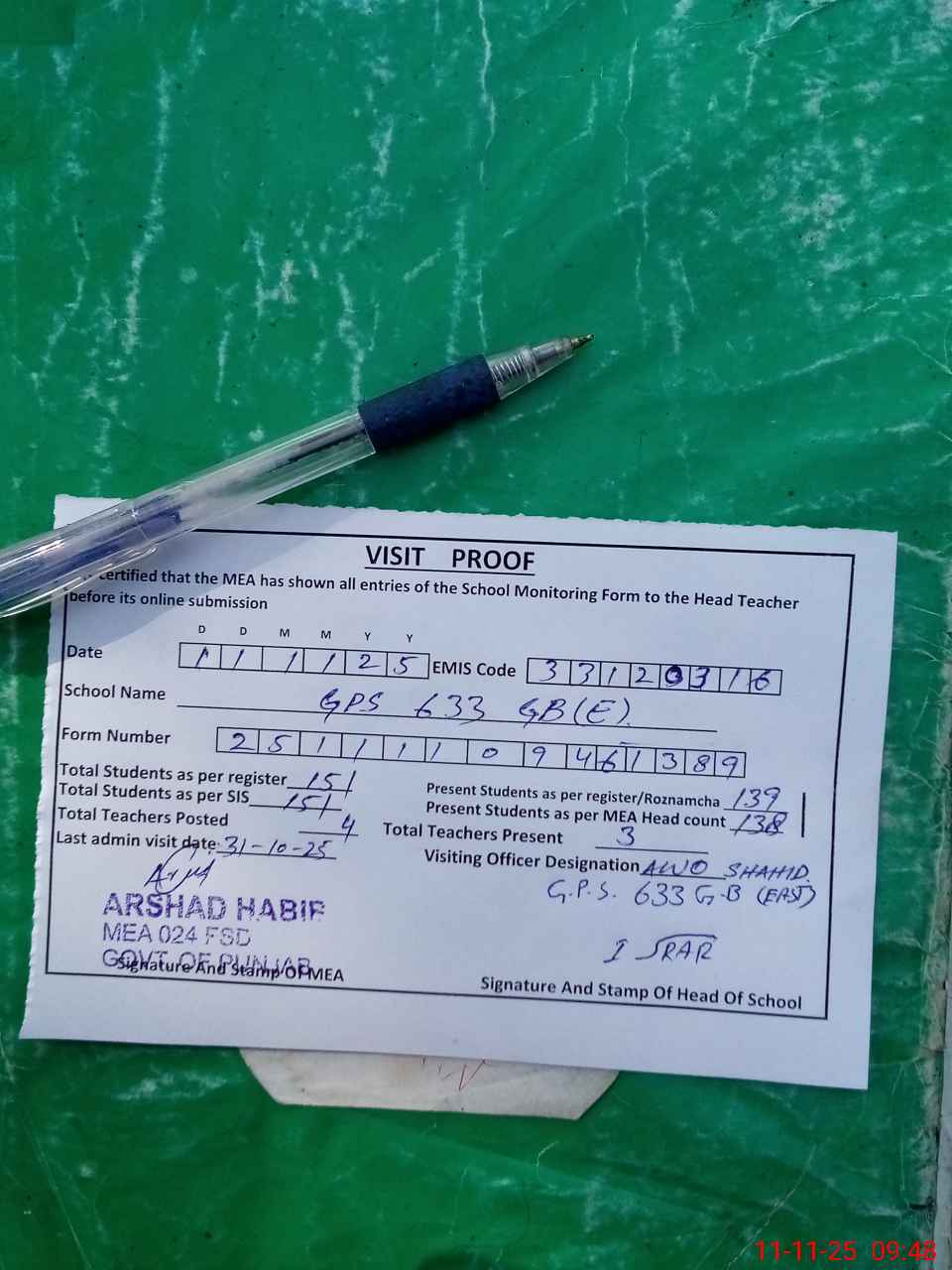 | Attendance Register | Head Teacher | MEA with School | Visit Proof |