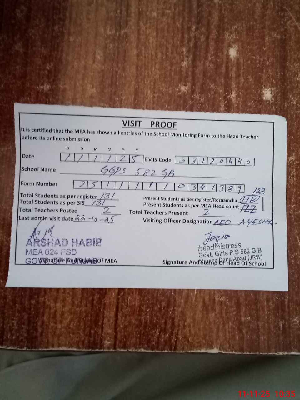 | Attendance Register | Head Teacher | MEA with School | Visit Proof |