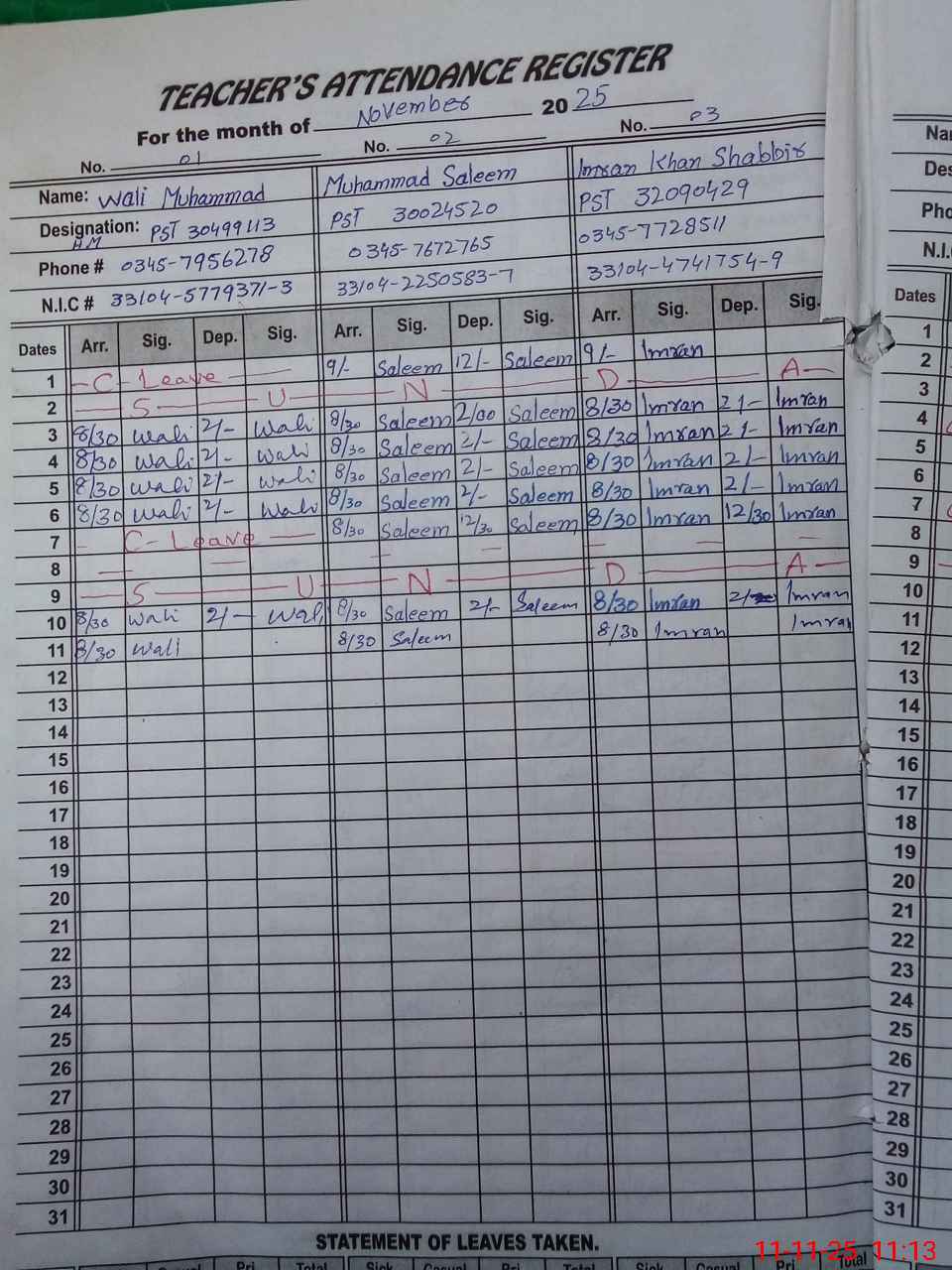 | CNIC | Full Name | Designation | R/C | Absence During Last Calender Month |