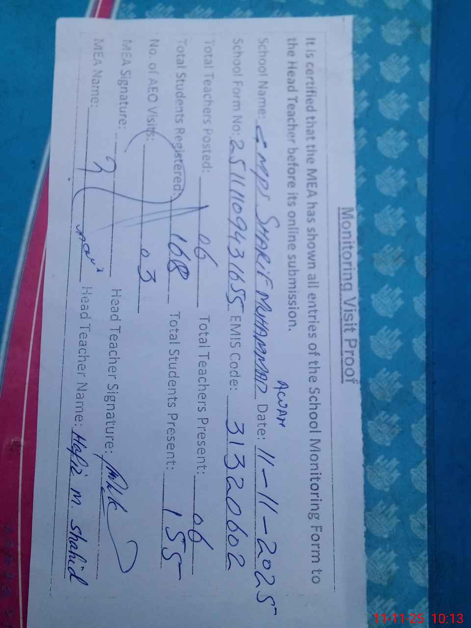 | EMIS Code: 31320602 | Name of School: GMPS SHARIF MUHAMMAD AWAN | |||