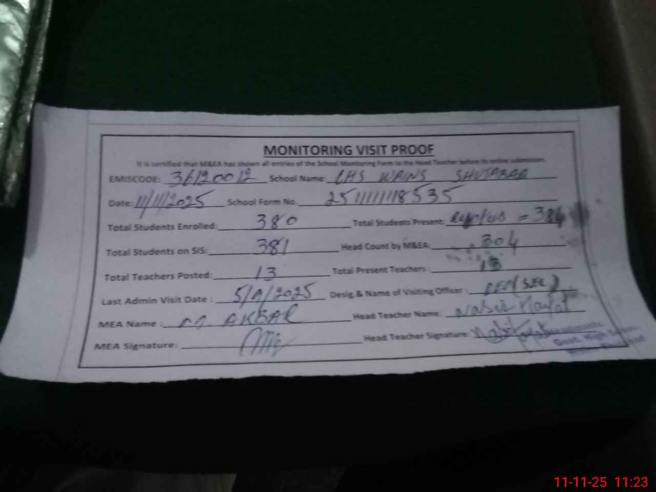 | Attendance Register | Head Teacher | MEA with School | Visit Proof |