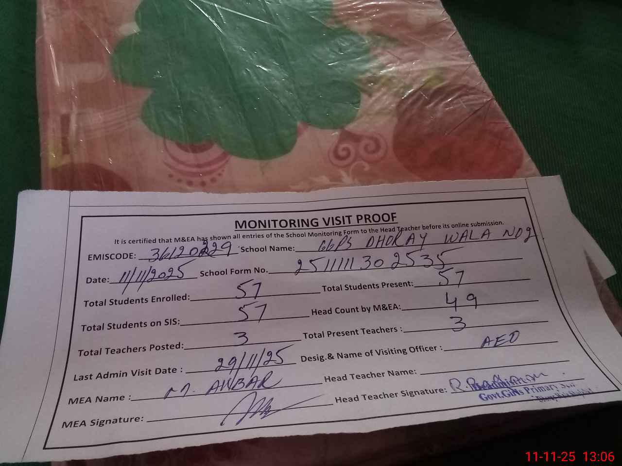 | Attendance Register | Head Teacher | MEA with School | Visit Proof |