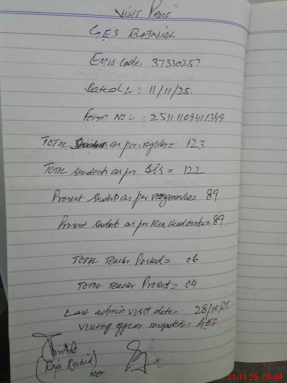 | Attendance Register | Head Teacher | MEA with School | Visit Proof |