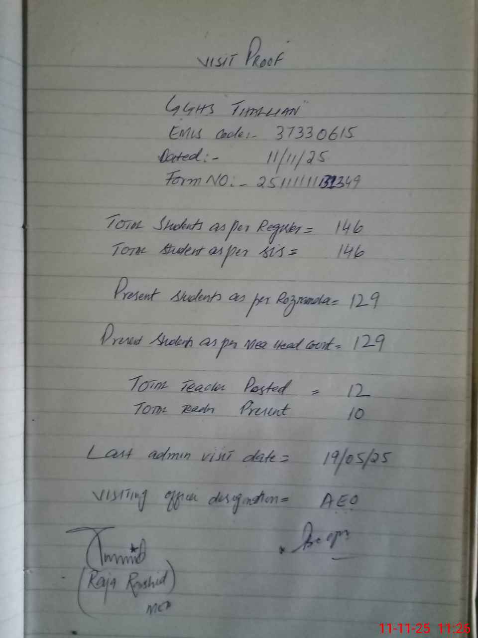 | Attendance Register | Head Teacher | MEA with School | Visit Proof |