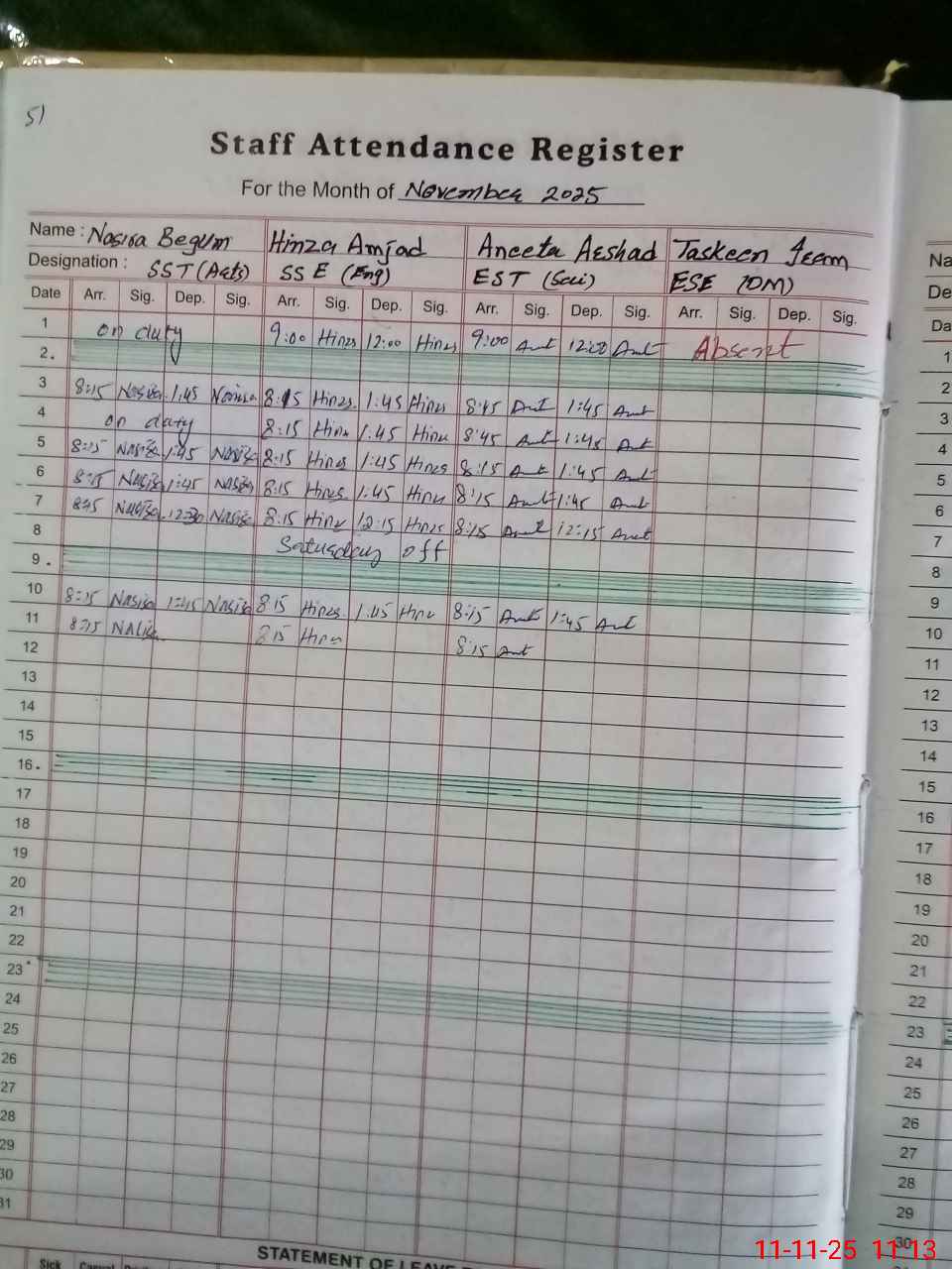 | CNIC | Full Name | Designation | R/C | Absence During Last Calender Month |