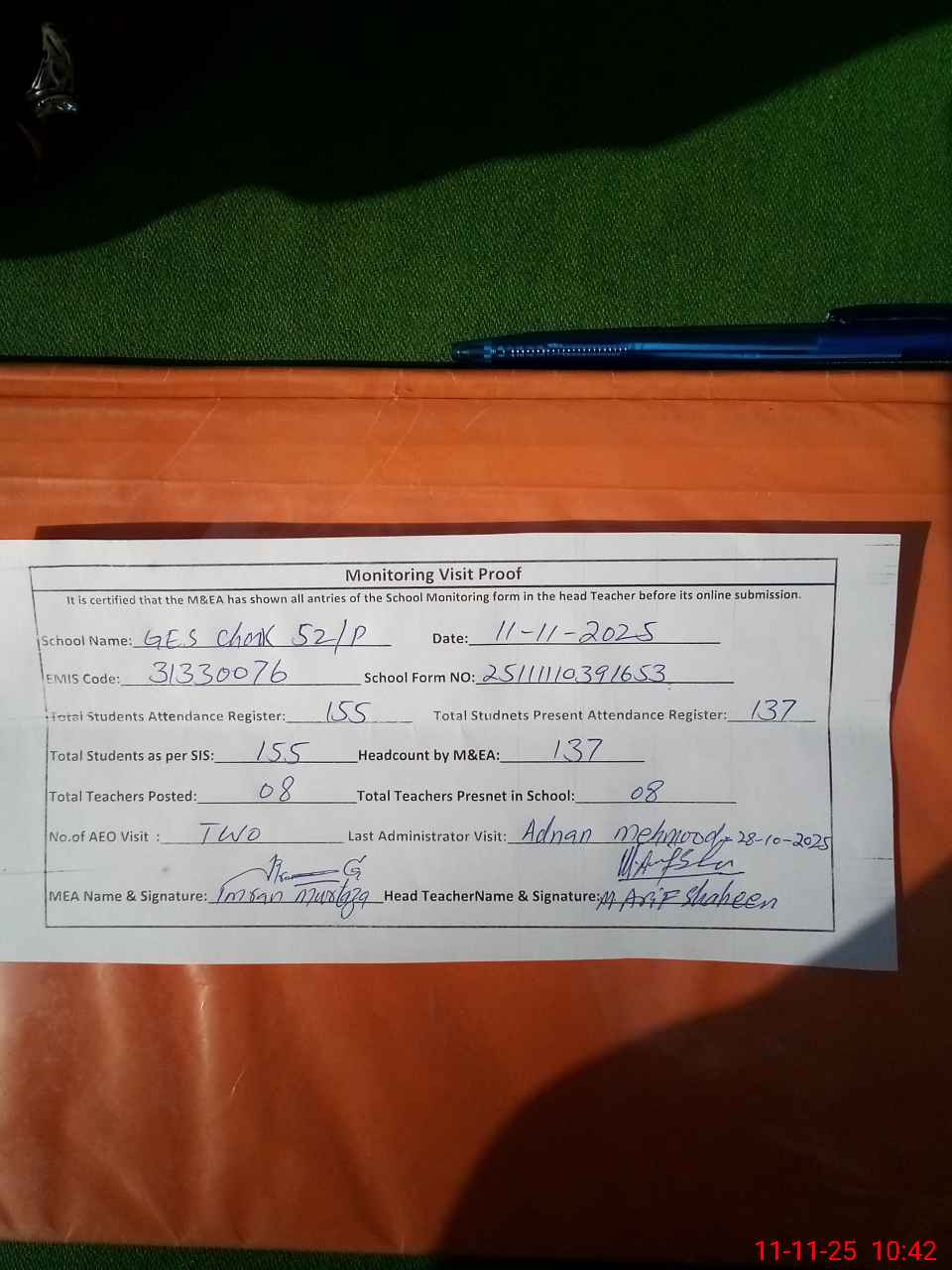 | Attendance Register | Head Teacher | MEA with School | Visit Proof |
