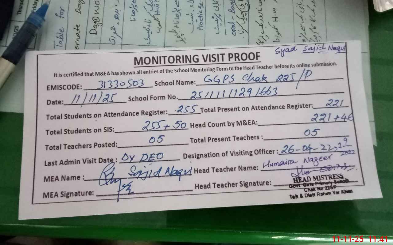 | EMIS Code: 31330503 | Name of School: GGPS CHAK 225/P (Basti Khambra Shahbazpur Road) | |||