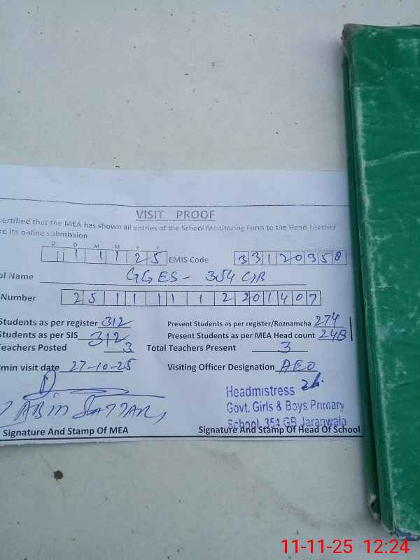 | EMIS Code: 33120358 | Name of School: GGES CHAK 354 GB JARANWALA | |||