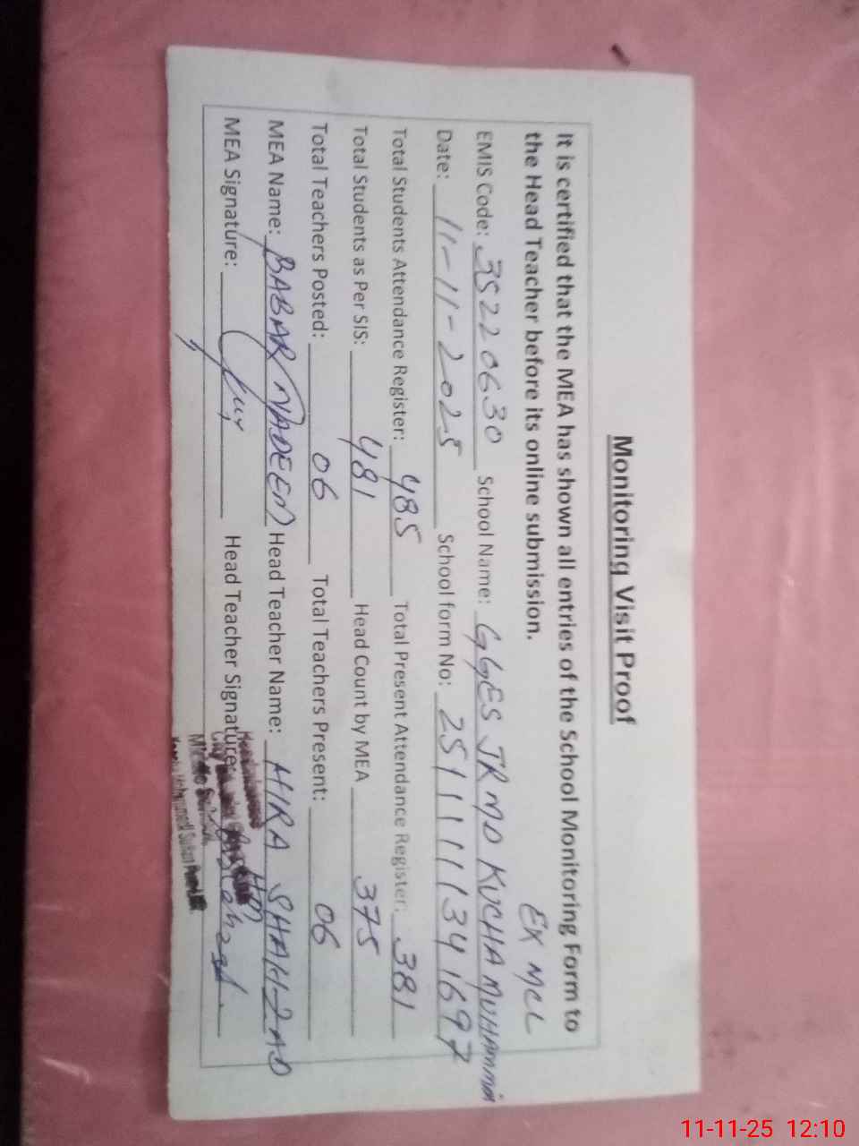 | Attendance Register | Head Teacher | MEA with School | Visit Proof |