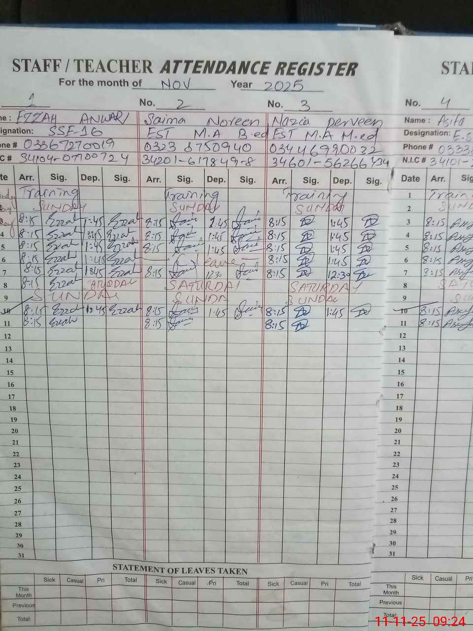 | CNIC | Full Name | Designation | R/C | Absence during last cal. month |
