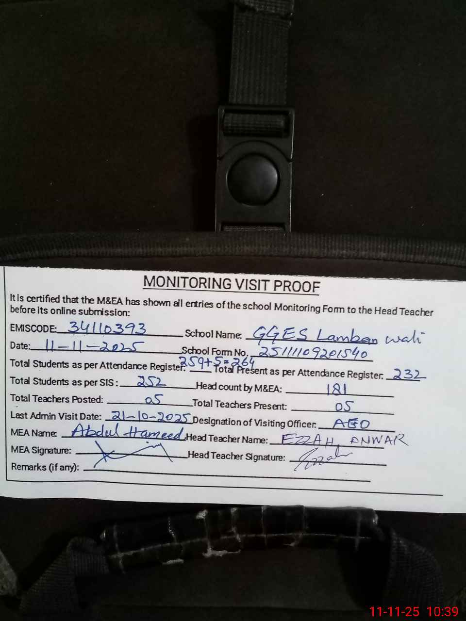| Monitoring Date: 11-11-2025 | Start Time: 11-11-2025 09:20 AM | End Time: 11-11-2025 10:40 AM | Name of MEA: N-**** Ha**** | |