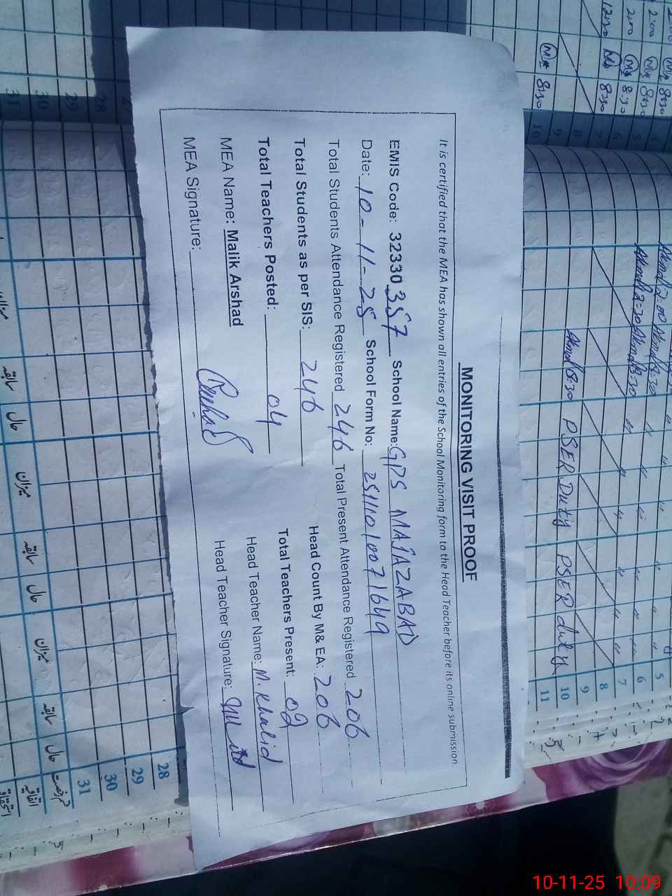 | Attendance Register | Head Teacher | MEA with School | Visit Proof |