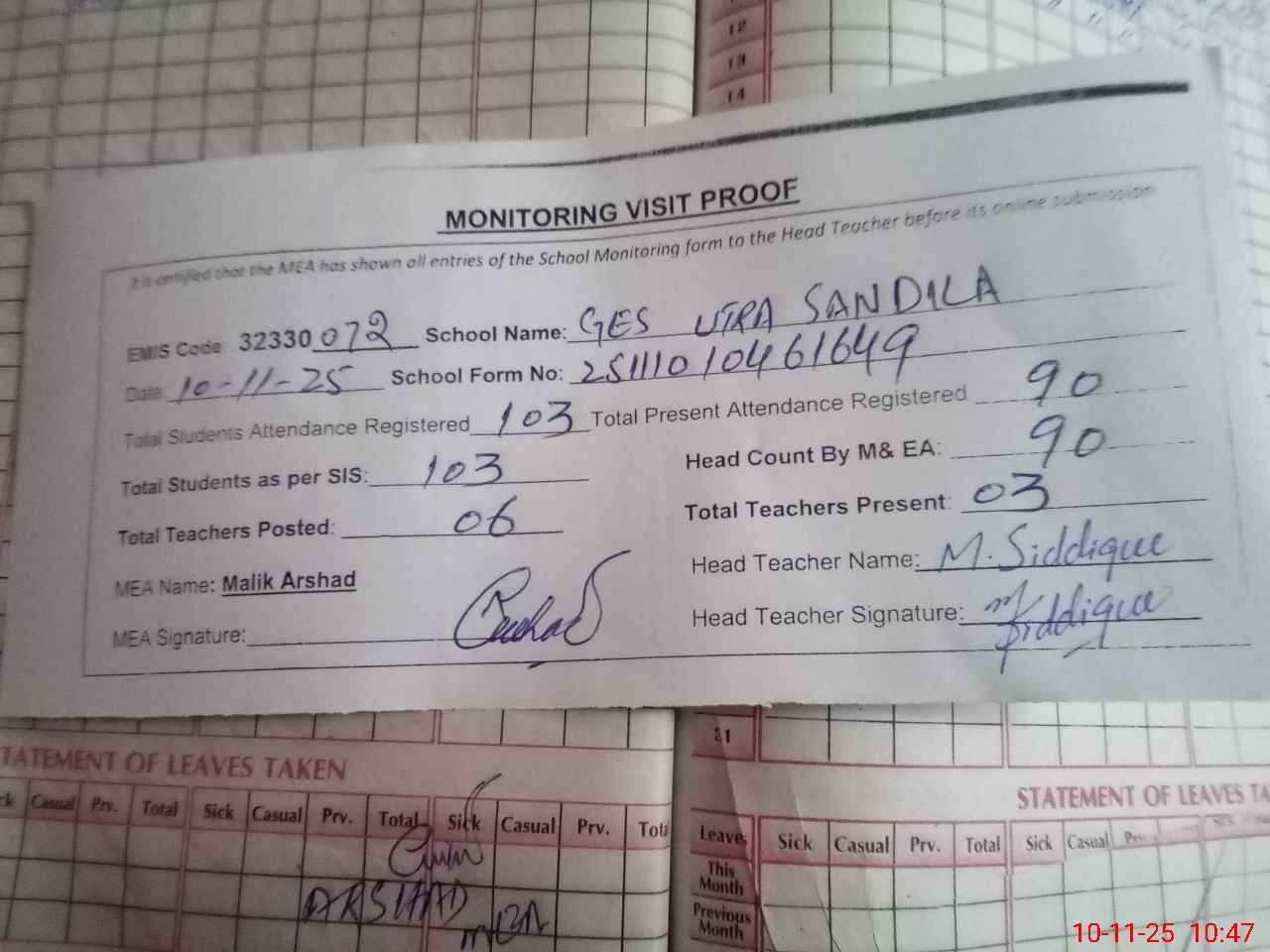 | Attendance Register | Head Teacher | MEA with School | Visit Proof |