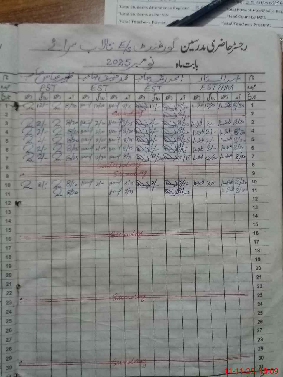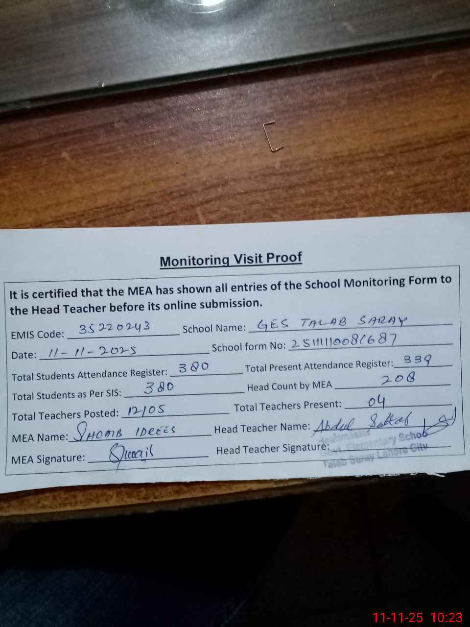 | Remarks (Use Separate Page if Required): 1 A difference of 131 students found between the present students as per attendance register and head counting of the classes 2 AEO Sundas Jabeen conducted last visit on 27 Oct 2025 3 The White board of one class is broken | |||||