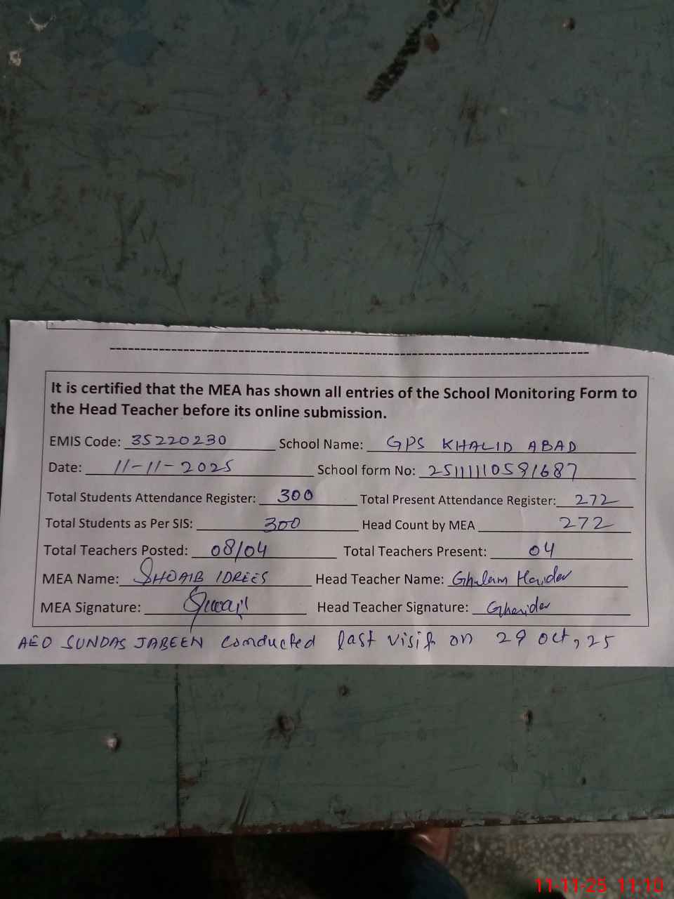 | Attendance Register | Head Teacher | MEA with School | Visit Proof |