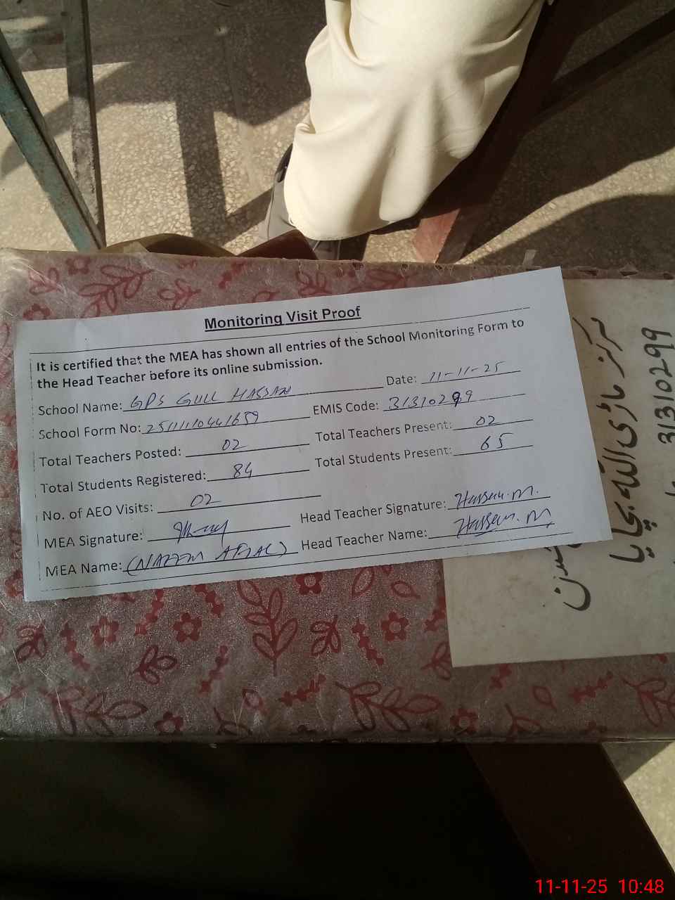 | Attendance Register | Head Teacher | MEA with School | Visit Proof |