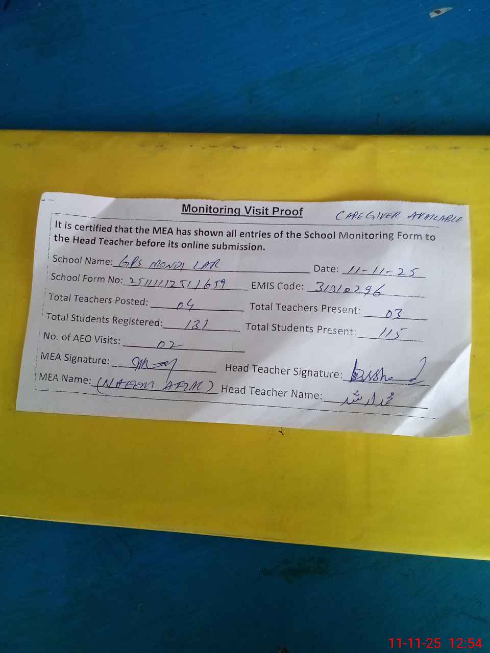 | EMIS Code: 31310296 | Name of School: GPS MONDI LAR (After Noon) | |||