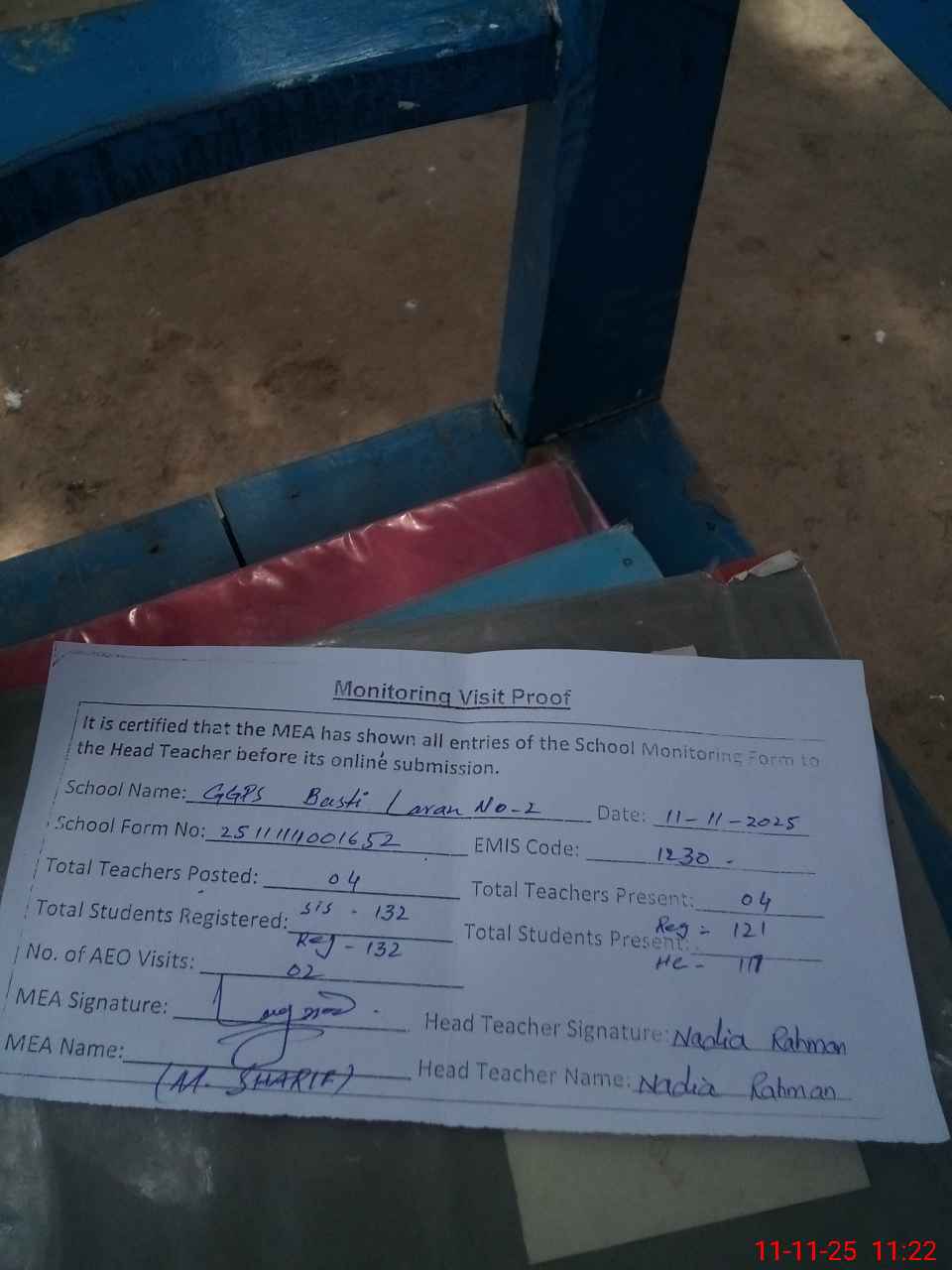 | Attendance Register | Head Teacher | MEA with School | Visit Proof |