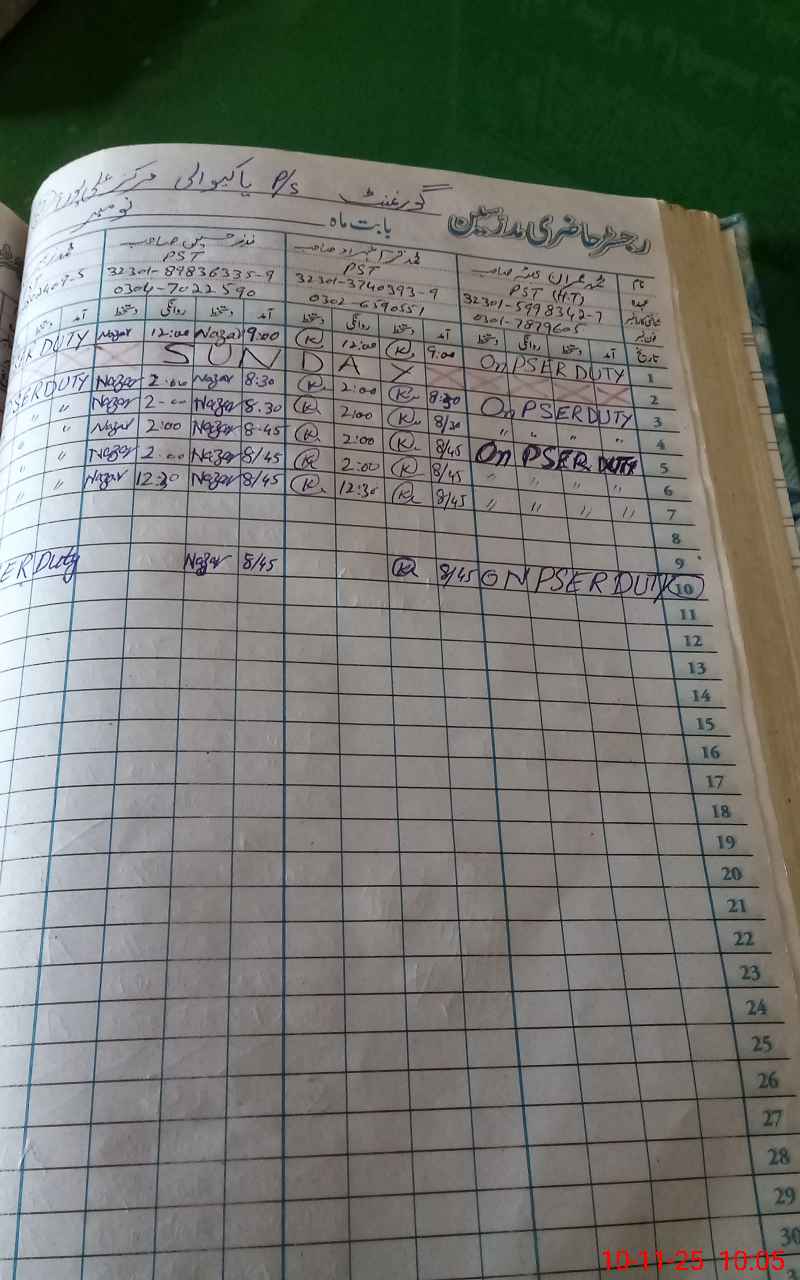 | CNIC | Full Name | Designation | R/C | Absence During Last Calender Month |