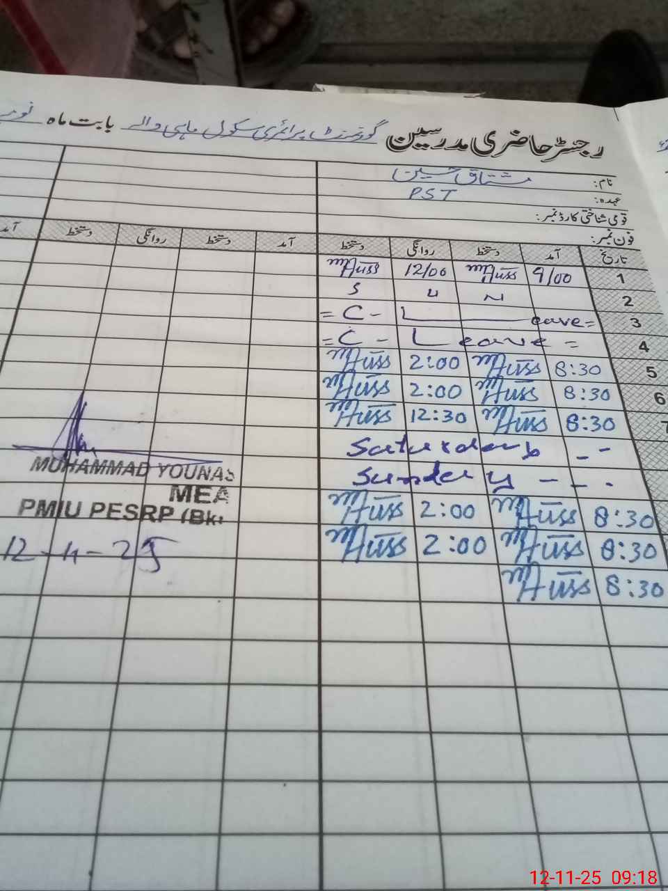 | CNIC | Full Name | Designation | R/C | Absence During Last Calender Month |