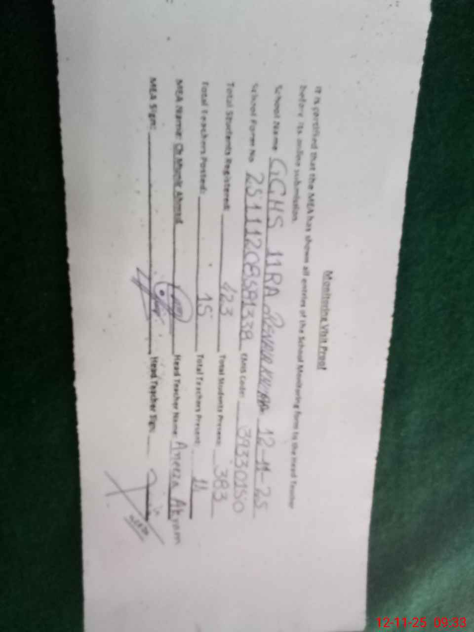 | Attendance Register | Head Teacher | MEA with School | Visit Proof |