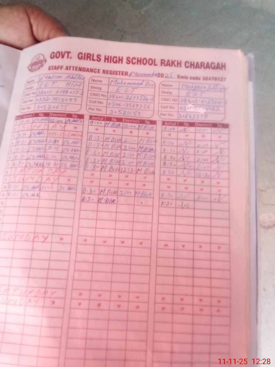 | CNIC | Full Name | Designation | R/C | Absence during last cal. month |