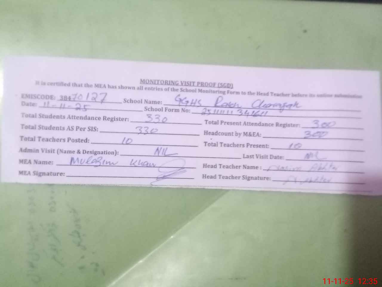 | Attendance Register | Head Teacher | MEA with School | Visit Proof |